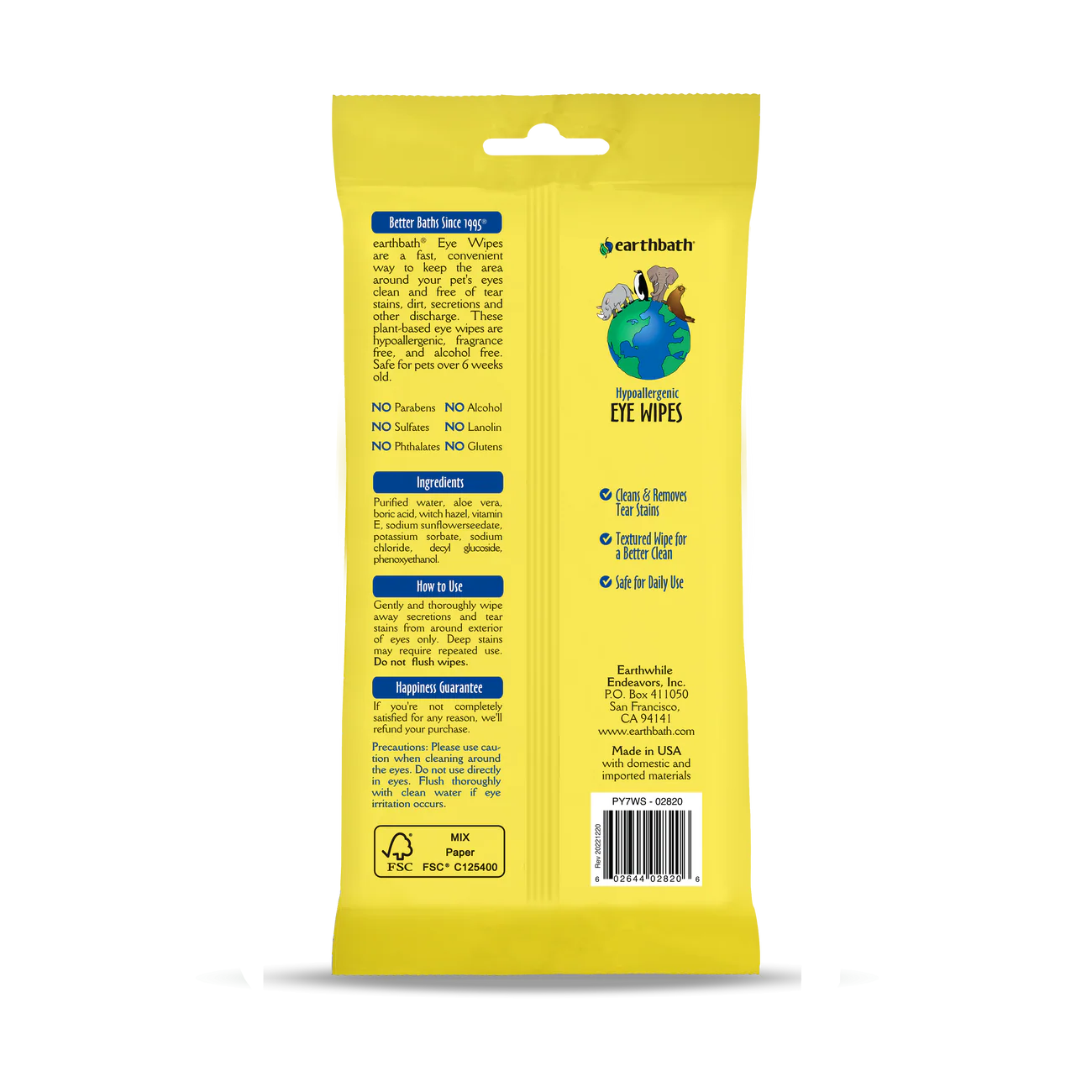 Earthbath eye wipes offers a safe, fast, convenient way to keep the area around your pet's eyes clean and free of tear stains, dirt, secretions and other discharge.