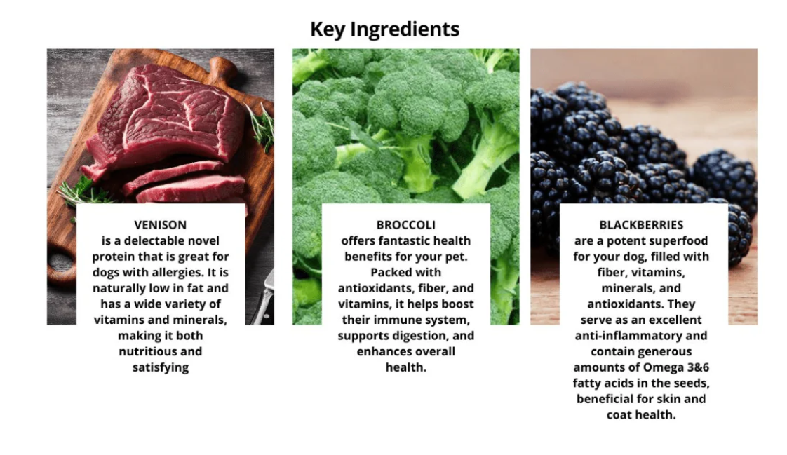 organic oats, venison, organic broccoli, blackberries, organic coconut oil