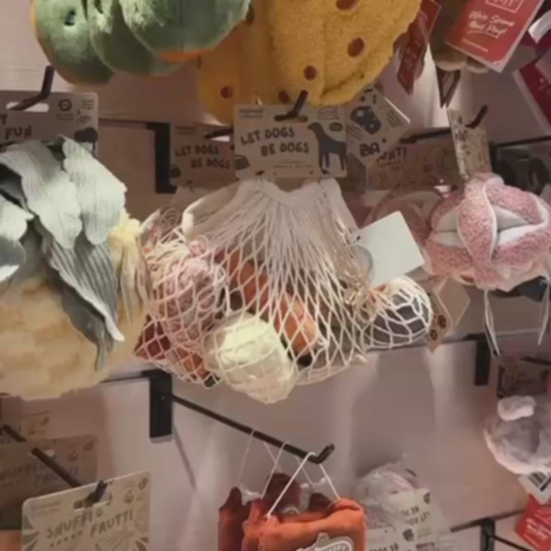 Crafted with a mix of textures and a gentle squeaker in each, this set stimulates light play and satisfies natural carrying instincts. Watch as your pup proudly parades their grocery haul from room to room!