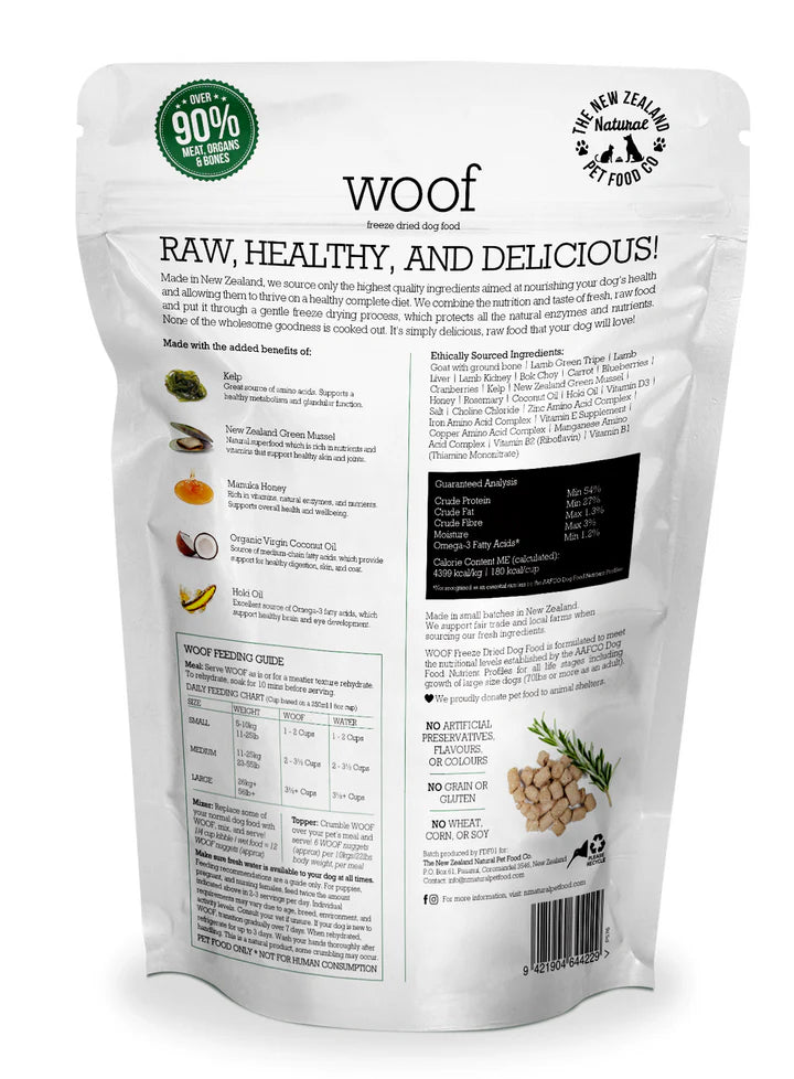 Woof dog food is made using only the highest quality ingredients aimed at nourishing your pup's health. This delicious food is made by combining the nutrition and taste of fresh, raw food that is put through a gentle freeze drying process, which protects all the natural enzymes and nutrients, so none of the wholesome goodness is cooked out!